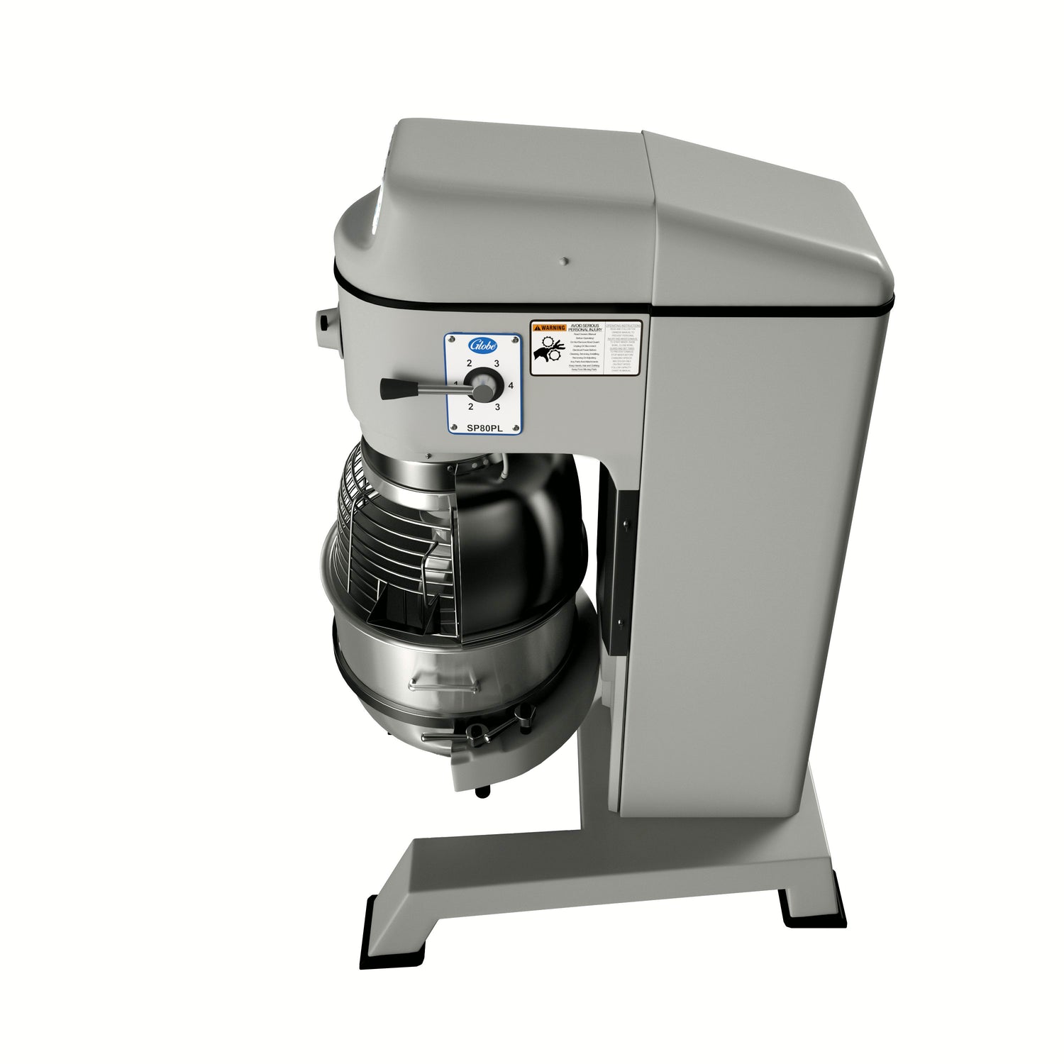 Globe (Middleby), SP80PL-3, (QUICK SHIP) Planetary Mixer, floor model, 4-speed (fixed), 80 qt. (75.7 liter) stainless steel bowl, #12 hub, includes: stainless steel removable bowl guard with built-in ingredient chute, stainless steel wire whip, aluminum flat beater, aluminum spiral dough hook & bowl truck, 1/8 HP power bowl lift, gear-driven, high torque oil bath transmission, heat-treated hardened steel alloy gears & shafts, thermal overload protection, front-mounted digital touchpad controls with 60-minute digital timer & last batch recall, auto-off, non-slip rubber feet, cast iron body, 3 HP motor, 208v/60/3-ph, 12.0 amps, cord, NEMA L15-20P, NSF, cETLus (Ships within 1-2 days)