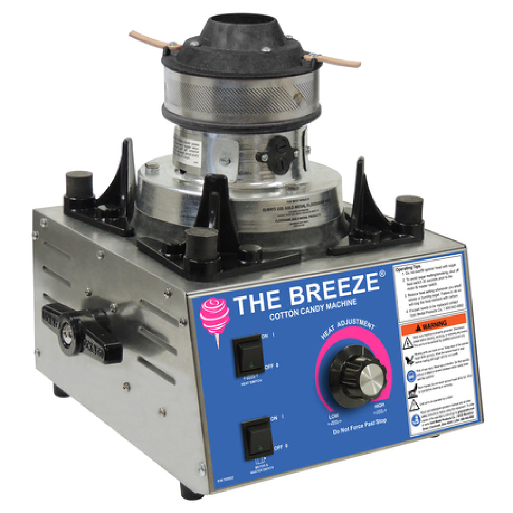 The Breeze® Cotton Candy Machine is tailored for foodservice operators seeking high throughput and durable construction. It integrates manual heat control and switch operation for ease of adjustment, with a stainless steel cabinet and aluminum floss pan construction for longevity and sanitation. Its compact 26" x 26" footprint supports efficient workflow, and the 17.08" height allows for versatile installation. The unit’s reliable 120v/60Hz power input and 996-watt capacity ensure consistent production, making it suitable for mid-volume vending or retail environments.