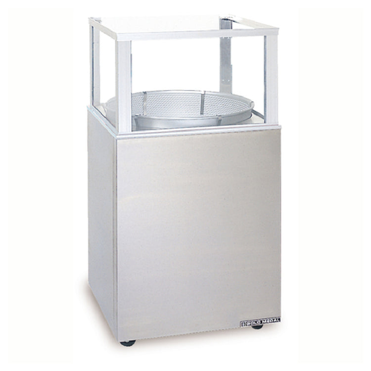 The Gold Medal 3036 base features a sturdy stainless steel construction with precise dimensions of 27-7/8 inches in width and depth, and a height of 35.25 inches. It weighs approximately 95 lbs, ensuring stability during continuous use. This foundation is intended for use with unifloss cotton candy machines, providing a reliable platform with a surface resistant to corrosion and cleaning agents. Designed to support high-volume retail and event-based applications, it complies with industry standards for performance and hygiene. The unit's dimensions and weight make it suitable for easy maneuverability and integration into existing foodservice layouts, offering dependable support for commercial operations requiring consistent product output and sanitation.