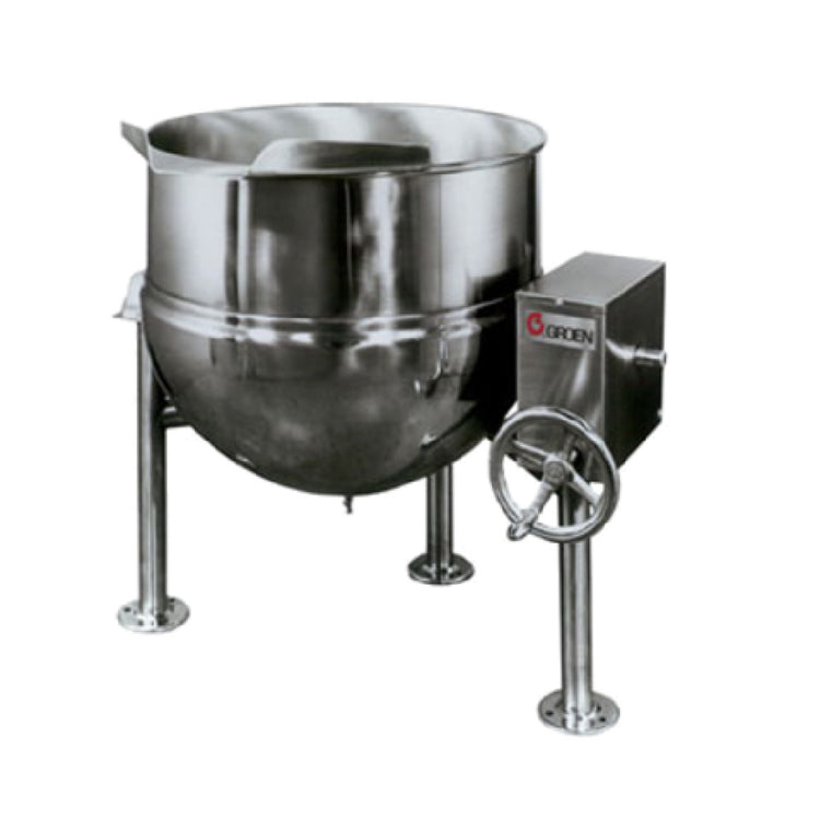 Groen, DL-80, Tilting Kettle, direct steam, 80-gallon capacity, crank tilt, 2/3 jacket, 316 stainless steel liner, tri-leg base, stainless steel construction, flanged feet, 25 PSI, NSF, Made in USA