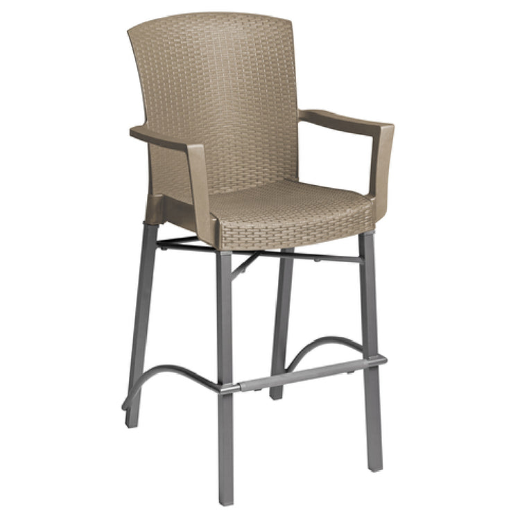 The Grosfillex US254181 Havana Classic Barstool With Arms is a commercial outdoor seating solution engineered for durability and style. Crafted from MPC® technology resin with a synthetic wicker texture finish, it offers resistance to weather elements and color-fast performance. Supported by a 1-1/4" square powder-coated aluminum base with footpads, this barstool provides stability and corrosion resistance. Ideal for outdoor hospitality or entertainment venues, it combines resilience with ergonomic design in a taupe hue, made in the USA. Its technical specifications ensure long-term performance in demanding outdoor environments.