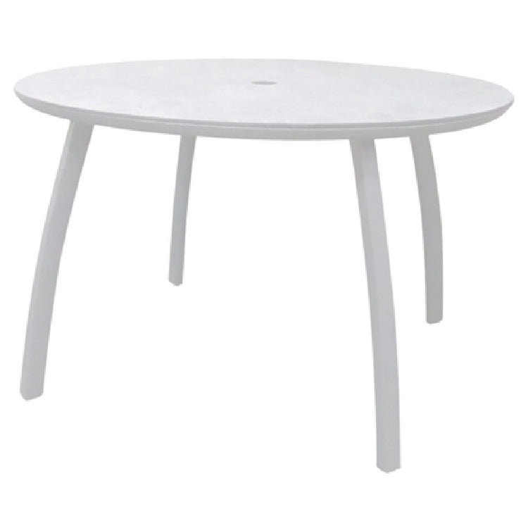 The Grosfillex UT42C096 Sunset Outdoor Table is a commercial-grade round table designed for outdoor dining and hospitality environments. Featuring a durable high-pressure laminate top with a 42-inch diameter and 29-inch height, this table provides stable and reliable performance for outdoor foodservice operations. Its glacier white base with satin finish and flared legs ensure balance and aesthetic appeal, while the 1-3/4" umbrella hole adds functionality for shading solutions. Constructed with rust and UV-resistant materials, it is suitable for high-traffic outdoor settings, including cafes, patios, and event spaces, offering long-lasting usability in demanding conditions.
