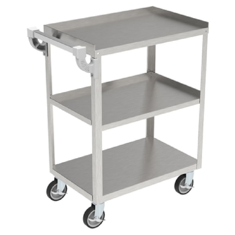 The GSW USA C-3111K Bus Cart features a sturdy metal frame with three solid shelves, each measuring approximately 25” - 29” in width and 15” - 17” in depth, supporting a balanced load capacity for moderate workloads. It is shipped knockdown, enabling simplified assembly and disassembly for cleaning and maintenance. The cart’s construction is resistant to corrosion, making it suitable for frequent cleaning routines. The approximate weight of the assembled unit is moderate for easy handling; the shipping weight is optimized for standard transport. Designed for general warehousing and foodservice transport, it operates without electrical requirements, relying solely on manual mobility. The product footprint is compact enough to fit in tight kitchen aisles, with angled legs providing stability. Dimensions include a width of about 25-29 inches, depth of 15-17 inches, and a height matching typical utility carts. The cart's finish and materials promote sanitation and ease of cleaning, with no special antimicrobial coatings specified.