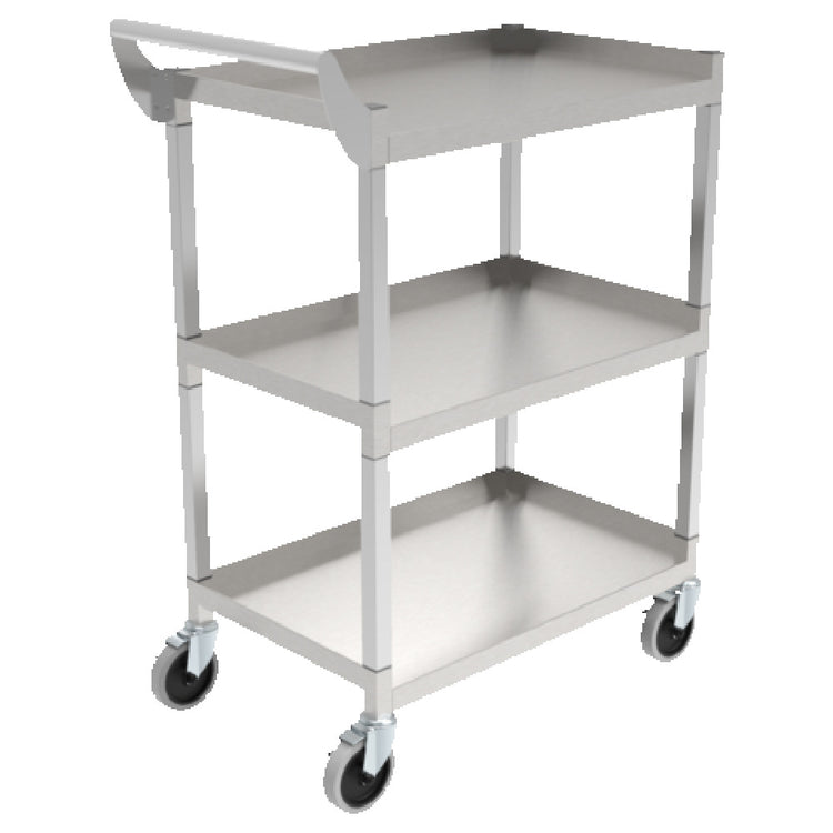 The GSW USA C-32K Bus Cart Small 3-tier is a durable, commercial-grade utility cart designed for efficient storage and transportation in foodservice environments. Constructed from solid 1" tubular stainless steel, this compact yet robust cart measures 29-1/2" wide by 18" deep and stands 35-1/4" high, featuring three solid shelves with approximate dimensions of 27" x 18". It supports a 200 lb. load capacity, making it suitable for various transport tasks within catering, catering services, and cafeteria settings. Its corrosion-resistant build ensures longevity and sanitation, while the versatile handle on one short side facilitates maneuverability, including the use of five-inch swivel casters for smooth operation. This model ships knock-down for easier storage and transport, meeting advanced food industry standards without certified labels.