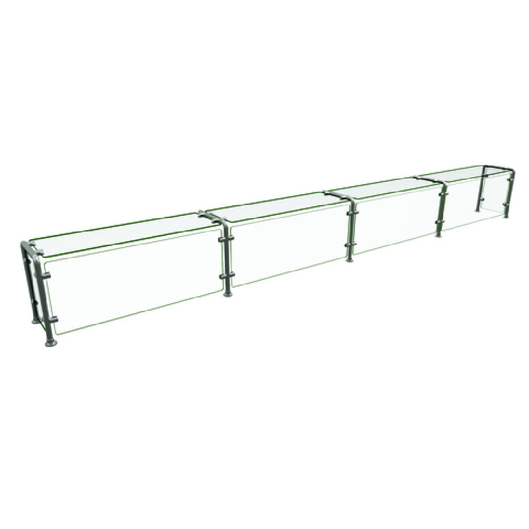 The Hatco EP12-14412 Flav-R-Shield® EP12 Food Shield Full Service Pass-over 4 Bays 144"W X 12"D X 18"H is a commercial-grade stationary sneeze guard designed for high-volume foodservice environments. Constructed entirely from 1/4" thick heat-tempered glass, it features a full-service pass-over configuration with four ergonomic bays measuring 144 inches in width, 12 inches in depth, and 18 inches in height. This food shield incorporates polished edges and 3/4" radius corners for safety and durability, making it suitable for protecting and displaying prepared foods in cafeteria lines, buffets, and catering stations. The unit is supported by 1" OD brushed stainless steel posts, ensuring corrosion resistance and stability. Its extensive glass construction offers excellent visibility and sanitation, catering to mid-volume restaurant, cafeteria, or buffet operations seeking functional and robust food display protection.