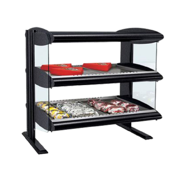 Hatco, HXMH-60D_120-208/60/1, Horizontal Heated Merchandiser with LED Lighting Warmer, 60" W, countertop, dual shelf, (24) divider rods, (6) bulbs per shelf, thermostat, infrared heat, hardcoat aluminum base, tempered side glass hinged to post