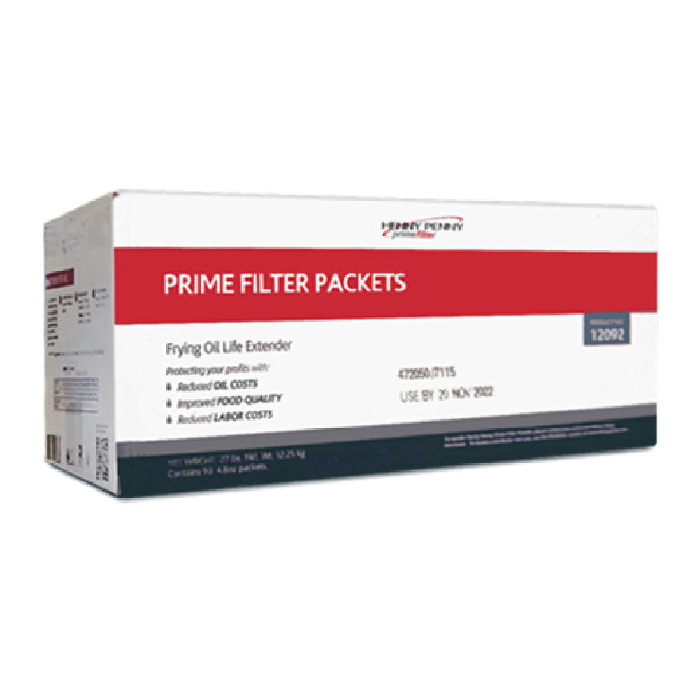 The Henny Penny 12092 Prime Filter Packets represent a high-capacity filtration solution designed for professional frying operations. Comprising 90 individual packets, each containing 12 fl oz. (4.8 or 237 ml) of filter powder, this product enhances the efficiency and longevity of commercial fryers. Engineered for large-volume foodservice environments, the Prime Filter Packets facilitate optimal grease management by providing a precise, ready-to-use filtration medium compatible with various fryer models. Their technical design emphasizes ease of handling, durability, and consistent performance, making them an essential component in high-throughput kitchens seeking reliable filter maintenance.