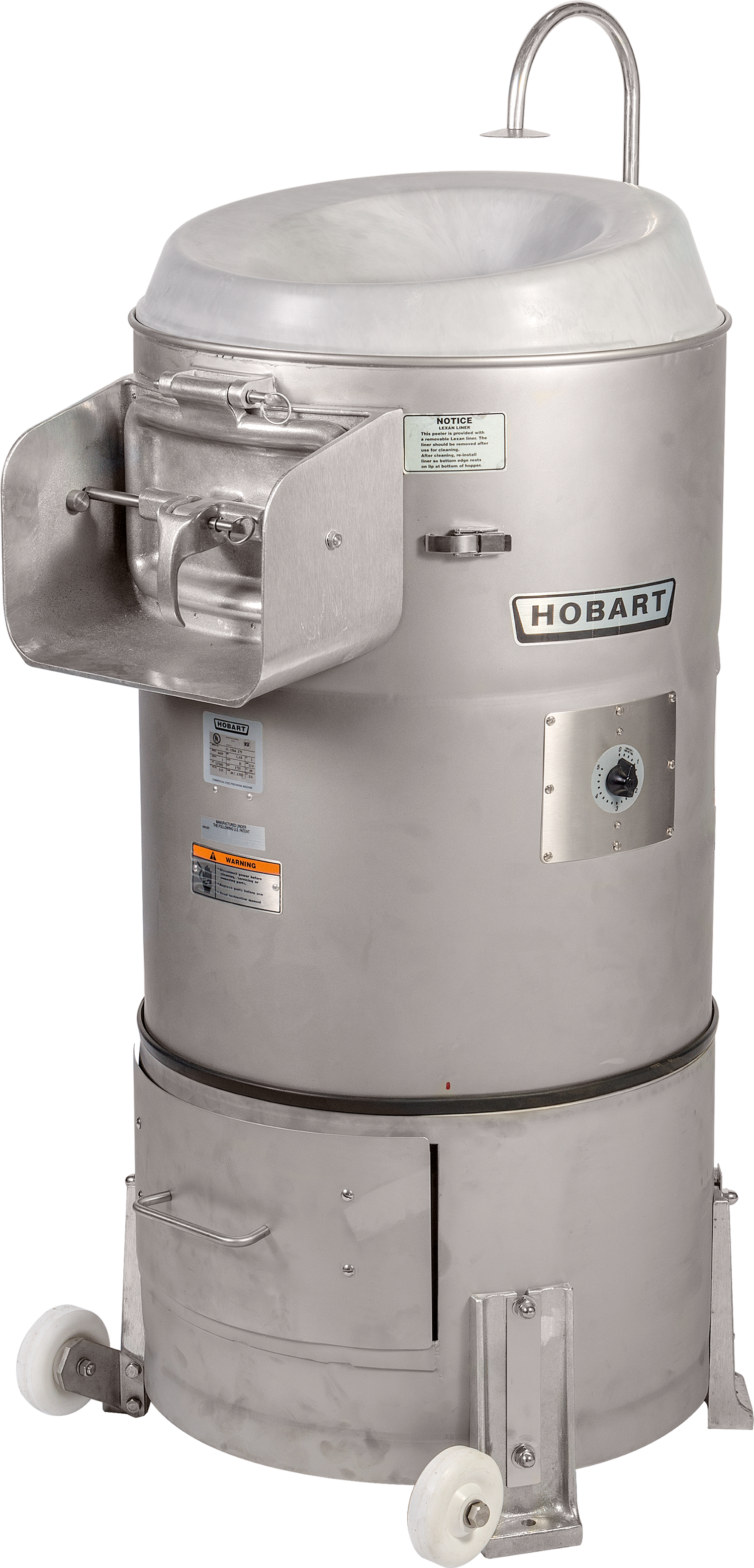 The Hobart 6460-1 Vegetable Peeler is a commercial-grade countertop equipment designed for efficient production of peeled potatoes within foodservice environments. It features a robust welded stainless steel construction with a V-belt drive system, allowing reliable operation. Capable of processing 50-60 pounds of potatoes in approximately 1 to 3 minutes, this machine offers precise control with an adjustable synchronous timer ranging from 1/2 to 4 minutes in 1/2-minute increments. Its removable abrasive silicon carbide disc and lexan liner simplify cleaning and maintenance, ensuring consistent sanitation and durability in high-demand kitchens. Ideal for medium-volume potato peeling tasks in food production, catering, and institutional kitchens, this peeler meets technical standards for food safety and performance excellence.