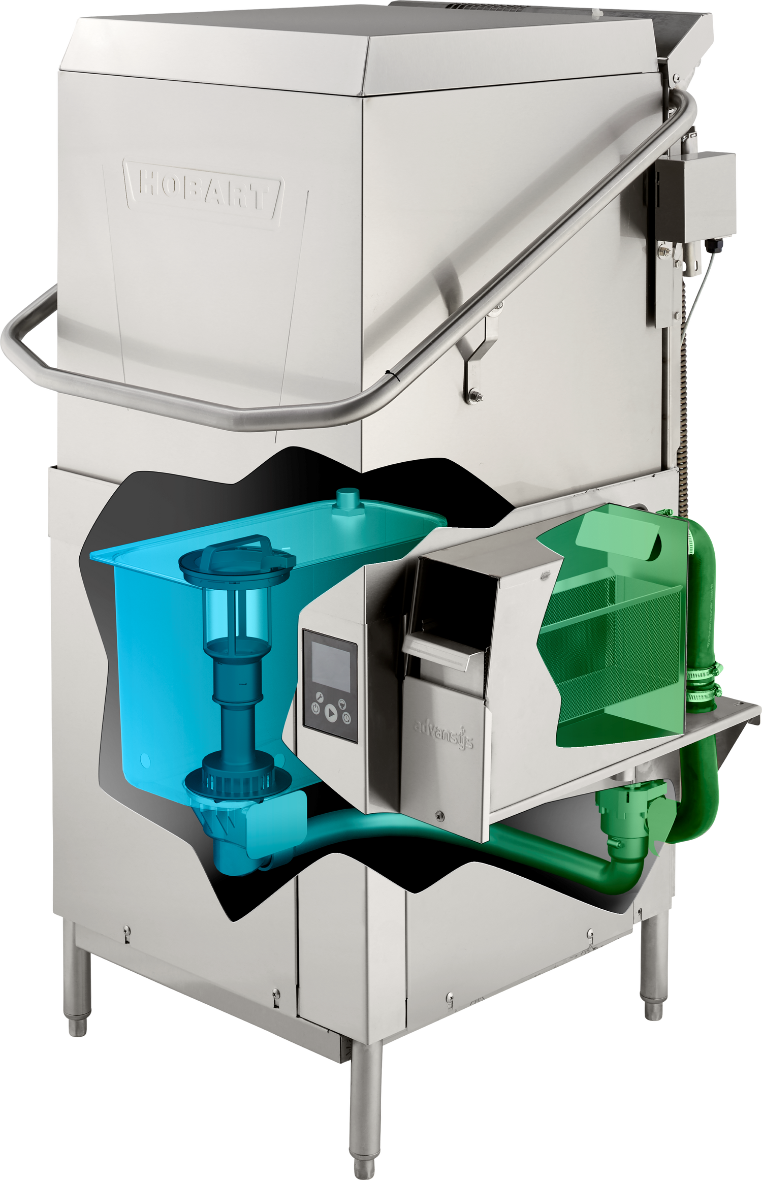 Hobart, AM16VL-ADV-2, Ventless Dishwashing Machine, door type, energy recovery, automatic soil removal (ASR), drain water energy recovery (DWER), high temp sanitizing, 208-240/60/3 (field convertible to single phase), internal condensing system, 40 racks/hour, straight-thru or corner installation, user-friendly smart touchscreen controls, Wi-Fi connectivity with SmartConnect app, Complete Delime™ with Delime Notification, Auto Dispensing, and Booster Guard™, Sense-A-Temp™ booster, electric tank heat, X-shaped wash arms, scrap screen and basket, door actuated start, door lock, stainless steel tank, tank shelf, chamber, trim panels, frame & feet, pumped drain air gap, drain water tempering, cULus, NSF, ENERGY STAR®. Factory Startup - Free for installations within 100 miles of a Hobart Service Office during normal business hours with appropriate notice, installation beyond 100 miles will be quoted by Service.