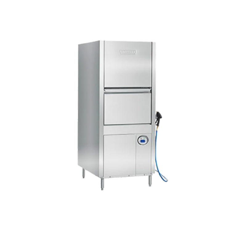 The Hobart PW10-2 Pot/Pan/Utensil Washer is a commercial-grade front-loading dishwasher designed specifically for high-efficiency cleaning of cookware, utensils, and kitchenware in busy foodservice environments. Built with durable stainless steel construction, it features a split door design and over/under rotating spray arms that ensure thorough sanitation. Capable of handling up to ten pans per cycle, it maximizes workflow by delivering up to 20 racks per hour, ideal for medium-volume kitchens requiring consistent, robust performance. The model operates at 480V, 60Hz, three-phase power, with adjustable cleaning cycles ranging from 2 to 6 minutes, precisely controlling wash time for optimal results. A comprehensive pre-rinse spray hose and cycle-specific notifications facilitate seamless maintenance and operation, making it a reliable solution for professional kitchens managing utensils and cookware.