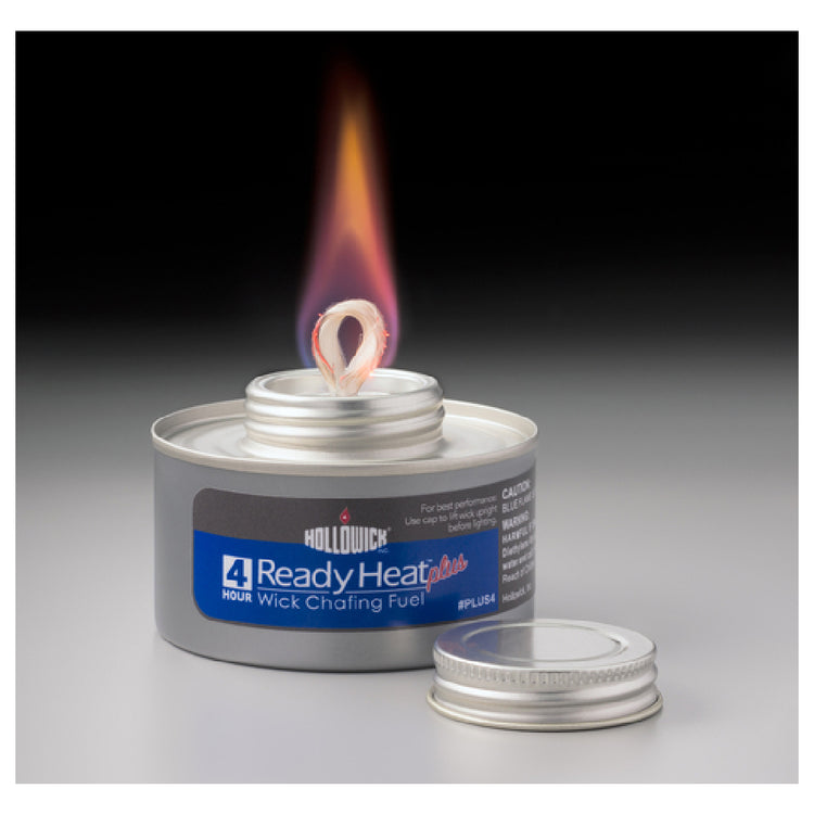 A commercial chafing dish fuel is a specialized heat source used to maintain the temperature of hot foods in buffet and catering settings. Engineered for professional foodservice environments, it typically features a wick or gel-based system that provides a steady, controllable flame. The Hollowick PLUS4 Ready Heat Plus™ Wick Chafing Fuel is installed in chafing dish stands to deliver reliable, odorless heat over extended periods, making it ideal for banquet service, catering, and large events. Its technical design ensures safety and performance consistency, supporting efficient food presentation in various hospitality and Foodservice settings.
