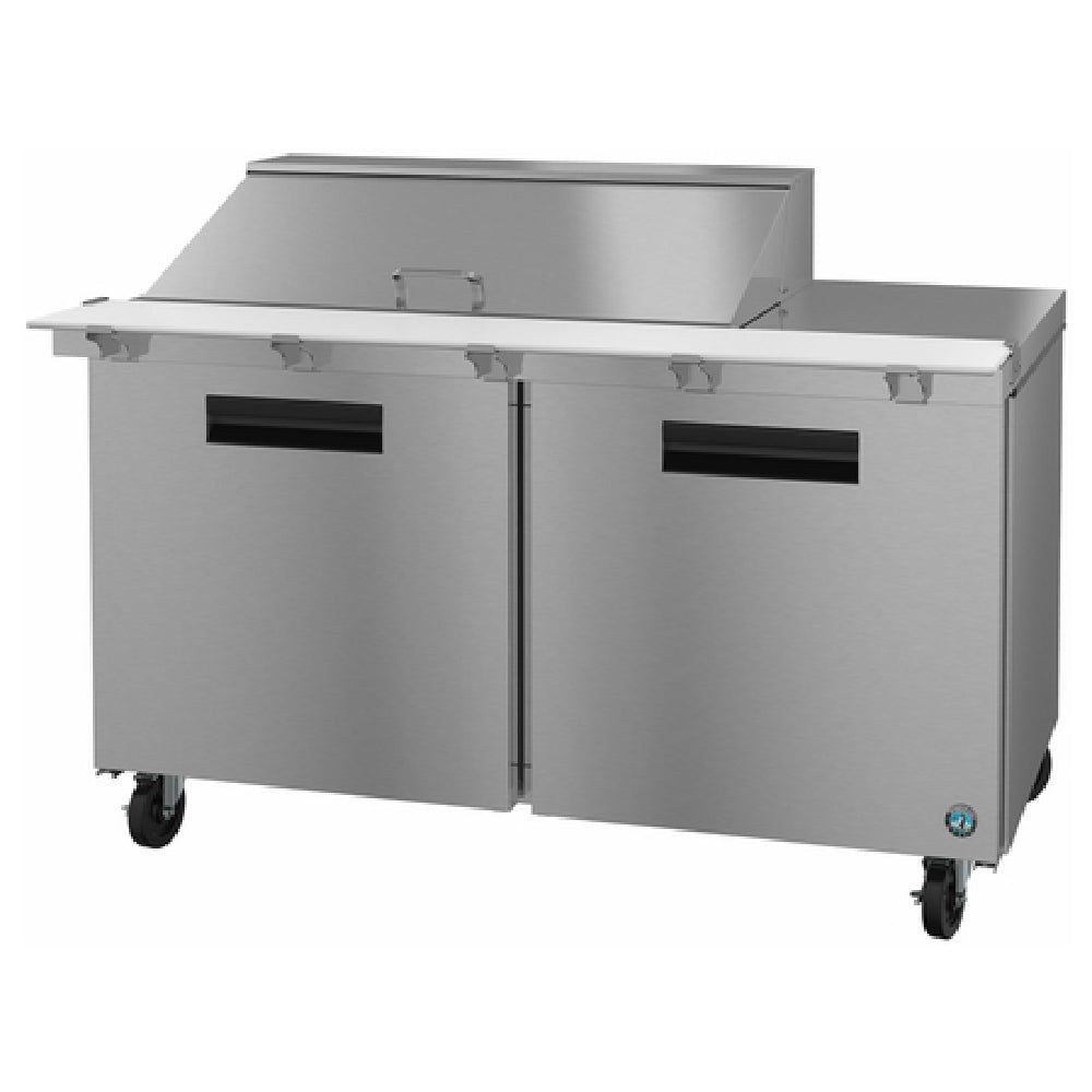 The Hoshizaki SR60B-18M Steelheart Series Mega Top Refrigerator Reach-in is a commercial-grade refrigeration unit designed for high-performance foodservice environments. This two-section refrigerated counter features a 60-inch width and 14.8 cubic feet of internal storage capacity, optimized for mid-volume restaurant and cafeteria operations. It employs a self-contained, rear-mounted refrigeration system utilizing R290 hydrocarbon refrigerant, ensuring efficient cooling with environmentally friendly technology. Constructed with stainless steel front, sides, and a hinged top cover, this unit provides durability, corrosion resistance, and ease of cleaning. The integrated 4-inch deep pan capacity supports versatile food storage, while the white polyethylene cutting board and adapter bars facilitate food prep workflows. Its precise temperature control and hot gas condensate removal ensure sanitary operation, making it a reliable choice for professional kitchen setups requiring consistent cold storage and high operational durability.