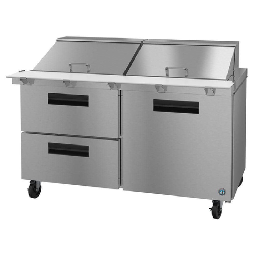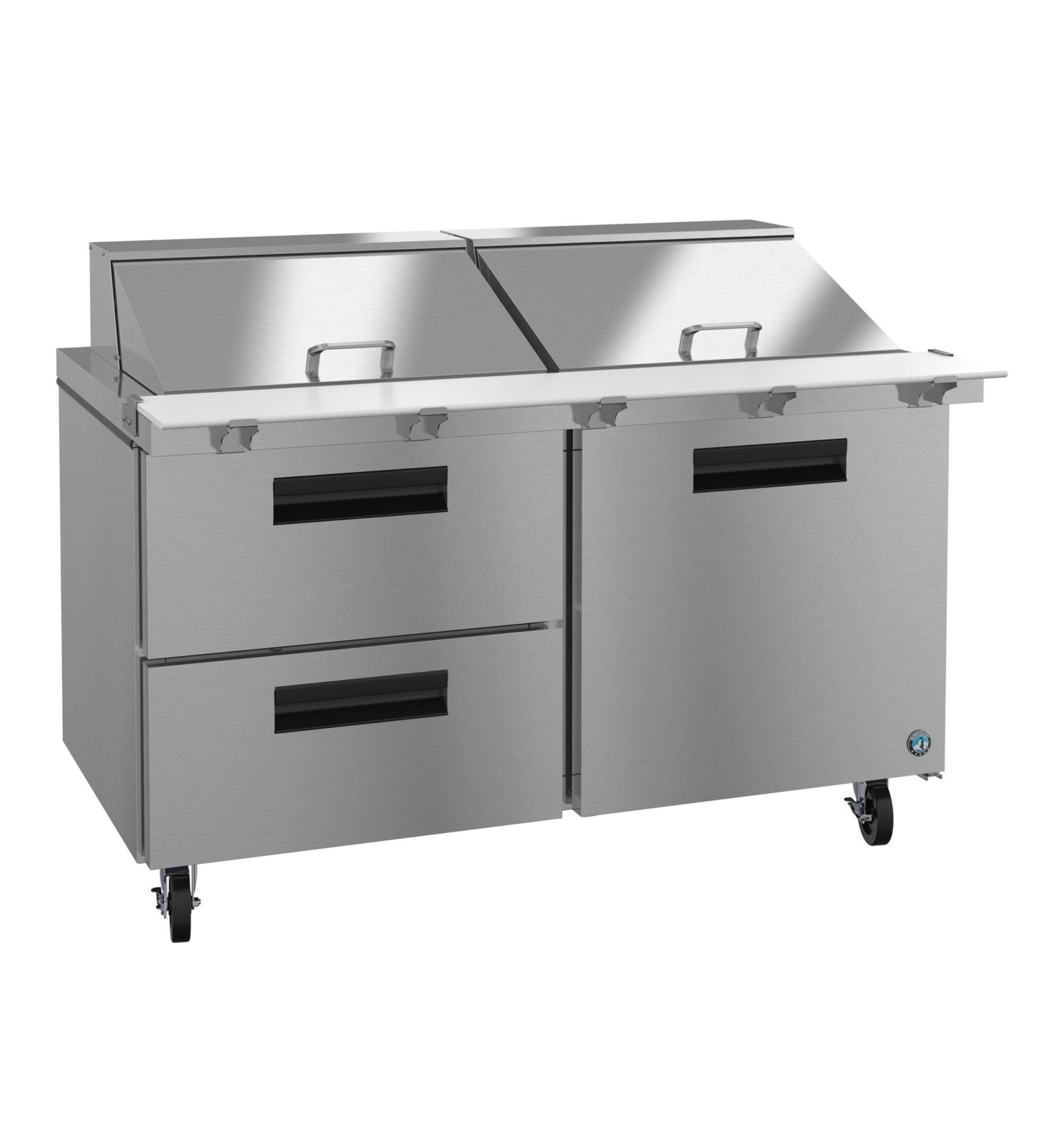 The Hoshizaki SR60B-24MD2 Steelheart Series Mega Top Refrigerator Two-section 60"W is a commercial-grade refrigerated counter designed for high-efficiency food storage in professional kitchens. This two-section model features a self-contained rear-mounted refrigeration system with a 1/3 HP compressor, utilizing environmentally friendly R290 hydrocarbon refrigerant for optimal cooling performance. Constructed with stainless steel front, top, and sides, it offers durability and sanitation in busy foodservice environments. Its 14.8 cubic feet capacity, combined with adjustable shelving and drawer configurations, ensures organized and accessible storage of prepped ingredients and menu components. The unit is engineered for reliable operation in demanding commercial settings, providing precise temperature control and ease of maintenance. Designed for moderate throughput kitchens, it supports streamlined workflow and food safety standards with robust materials and efficient refrigeration technology.
