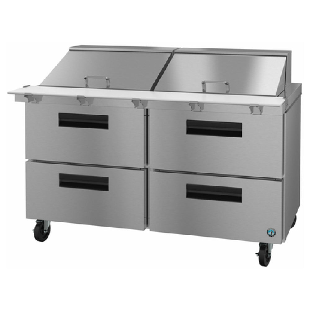 The Hoshizaki SR60B-24MD4 Steelheart Series Mega Top Refrigerator Two-section 60"W is a commercial-grade refrigerated counter designed for high-efficiency food storage in professional kitchens. Featuring a rear-mounted self-contained refrigeration system, it maintains optimal temperatures for perishable ingredients. The unit offers 14.8 cubic feet of interior capacity, equipped with four drawers that optimize access and organization. Constructed with stainless steel interior and exterior front, it provides durability and a sleek appearance suitable for busy restaurant, cafeteria, or catering operations. The unit's design incorporates a full set of adapter bars, white polyethylene cutting boards, and maximum pan depth of 6 inches, making it ideal for food prep workflows requiring quick access to refrigerated ingredients within a hygienic environment. It operates with a 1/3 HP R290 hydrocarbon refrigerant compressor, ensuring energy-efficient cooling and compliance with modern standards. The precise technical specifications include dimensions of 60 inches in width, 34 inches in depth, and 44.25 inches in height, with stainless steel sides and a hinged top cover for easy access and cleaning.