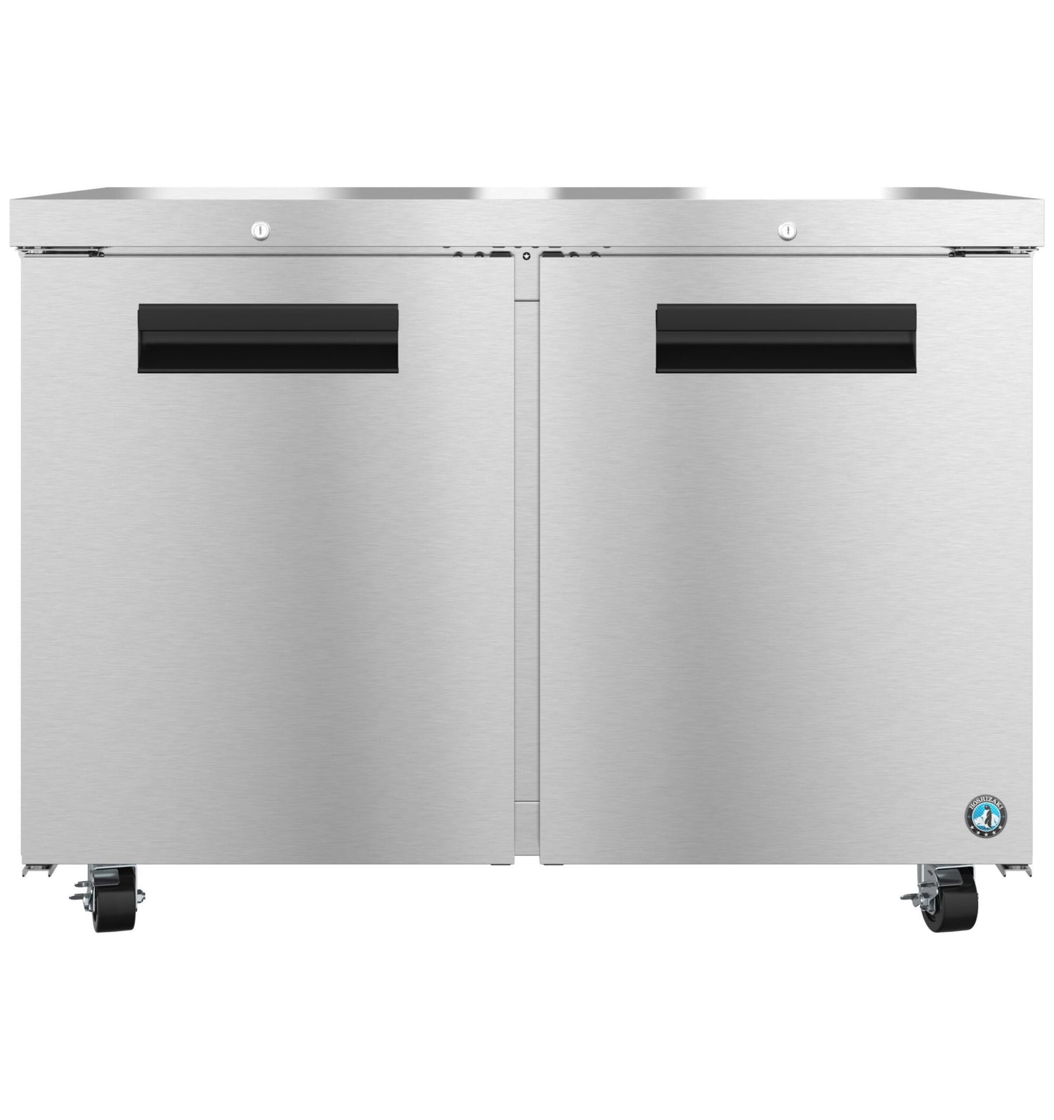 Hoshizaki, UF48B-01, Steelheart Series Undercounter Freezer, reach-in, two-section, 48"W, 13.66 cu. ft., self-contained rear mounted refrigeration system, (2) reversible solid hinged doors, cylinder door lock, (2) adjustable shelves, stainless steel interior, stainless steel exterior front, sides & top, (4) 4" stem casters (2 with brakes), R290 hydrocarbon refrigerant, 1/3 HP, cord, NEMA 5-15P, cETLus, ETL-Sanitation (Special Order)