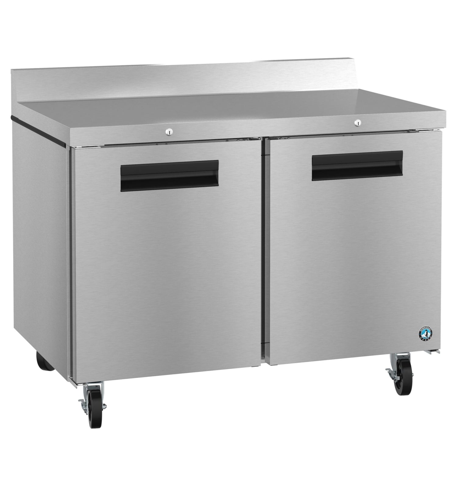 Hoshizaki, WF48B-01, Steelheart Series Worktop Freezer, reach-in, two-section, 48"W, 13.66 cu. ft., self-contained rear mounted refrigeration system, (2) solid hinged doors, cylinder door lock, (2) adjustable shelves, stainless steel interior, stainless steel exterior front, sides & top, (4) 6" stem casters (2 with brakes), hot gas condensate removal, R290 Hydrocarbon refrigerant, 1/3 HP, cord, NEMA 5-15P, cETLus, ETL-Sanitation (Special order)
