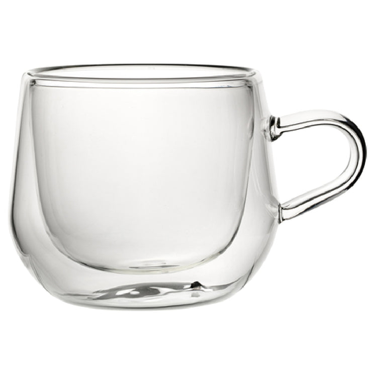 This coffee mug features borosilicate glass construction with double-walled insulation for superior heat retention and visual appeal. Its durable non-tempered glass withstands commercial use, while the 14 oz. capacity supports espresso-based beverages and specialty drinks. Designed for quick cleaning, it integrates seamlessly into high-volume café workflows, minimizing breakage and ensuring consistent presentation. The mug’s precise dimensions accommodate standard dishwashing and stacking for efficient storage, making it ideal for both front-of-house presentation and behind-the-scenes warewashing routines.
