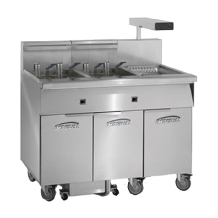 The Imperial IFSCB450EUT_240/60/3 Fryer Electric Floor Model is a commercial-grade deep frying unit designed for high-capacity foodservice environments. Featuring four stainless steel fry tanks, each with a 50 lb. capacity, this electric floor-standing appliance is optimized for medium-volume operations requiring consistent frying performance. Equipped with tilt-up elements, a built-in filter system, and a dump station, it ensures efficient workflow and simplified maintenance. The electronic thermostat maintains precise temperature control, while its stainless steel construction guarantees durability and sanitation in busy kitchens. With a footprint of 77.5 inches wide, 34 inches deep, and a height of 44.13 inches, this model fits seamlessly into large-scale culinary setups and delivers reliable, restaurant-ready frying capability. The inclusion of a food warmer, dump pan, joiner strips, and a filter starter kit enhances operational efficiency, making it a critical appliance for high-output food preparation facilities.