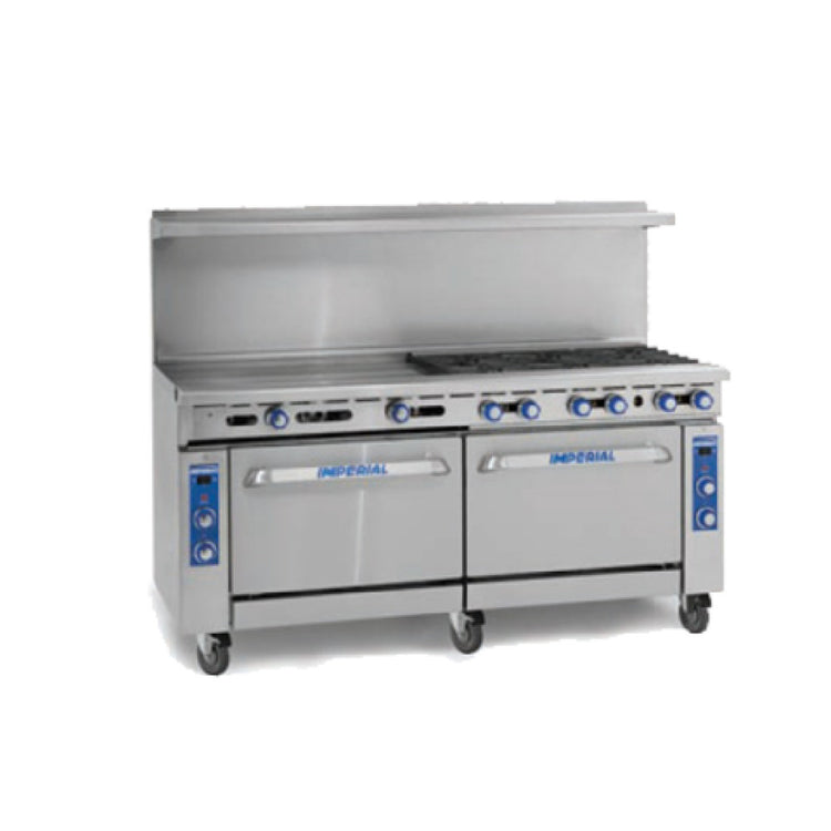 A commercial restaurant range is a heavy-duty cooking appliance designed for high-volume foodservice environments, combining multiple heat sources such as burners, griddles, and ovens. The Imperial IR-4-G48-CC_NAT model, with its 72-inch width, offers a combination of four open burners, a large griddle, and convection ovens, suited for intensive daily use in restaurants, catering, and institutional kitchens. It is typically installed in professional kitchens requiring durable, efficient, and versatile cooking solutions to handle large throughput and diverse menu preparation.