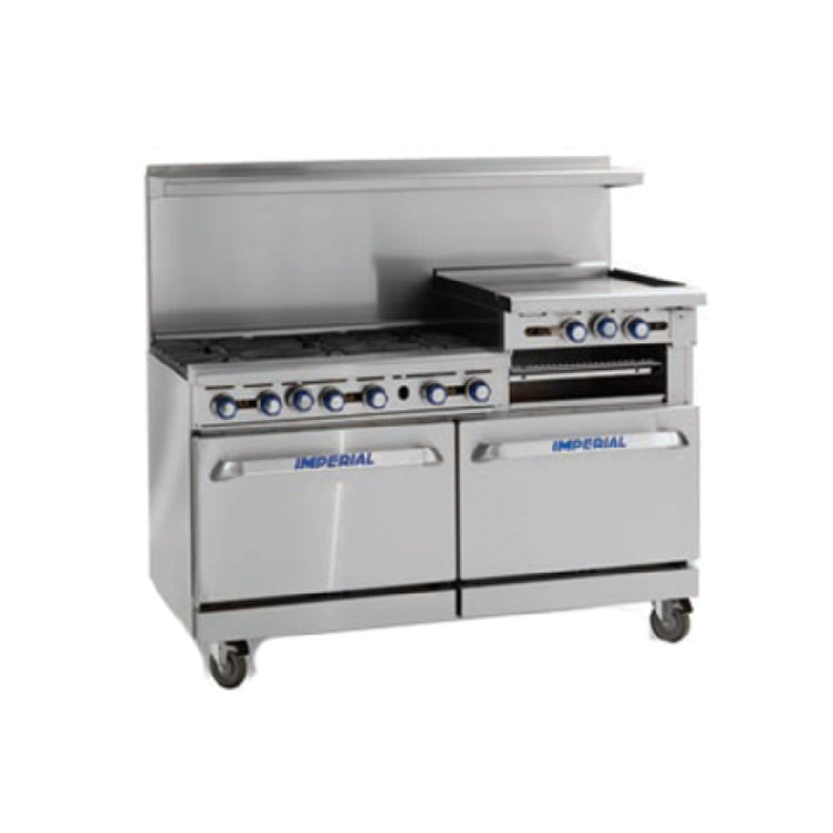 A commercial restaurant range is a heavy-duty cooking appliance designed for use in professional kitchen environments, offering multiple burners, griddles, and ovens to support high-volume food preparation. The Imperial IR-6-G24-XB_NAT features a robust 60-inch gas cooktop with six open burners, a large griddle, and a standard oven, making it ideal for restaurant kitchens that require versatile, durable equipment capable of handling demanding production workflows and ensuring consistent cooking performance.