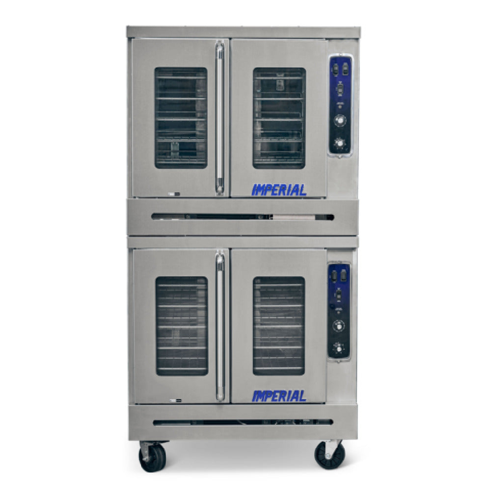 The Imperial PCVE-2_208/60/1 (QUICK SHIP) Convection Oven is a commercial-grade electric convection oven designed for high-performance baking and roasting in busy foodservice environments. Featuring two full-sized decks with porcelain interior and stainless steel exterior finish, this unit provides even heat distribution through a dual open 60/40 door system and manual thermostatic controls. Equipped with a 2 speed fan motor and five racks per deck, the oven allows precise airflow management and ample capacity for baking multiple trays simultaneously. With dimensions of 38 inches in width, 41.5 inches in depth, and 74 inches in height, it is ideal for medium-volume operations such as restaurant kitchens, bakeries, or institutional settings. The model operates on 208V, single-phase power, consuming approximately 11.0 to 15.99 kW per deck, and weighs 1005 lbs. Constructed entirely from durable stainless steel with an easy-to-clean porcelain interior, it ensures longevity and sanitation. This convection oven also features CE, cETLus, and ETL sanitation approvals, designed for reliable performance and consistent results in demanding commercial environments.