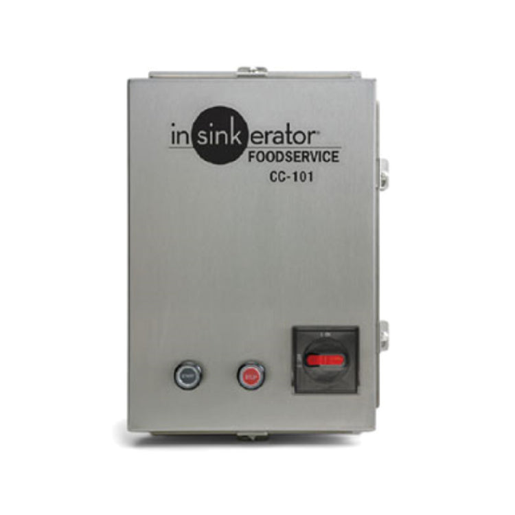 The InSinkErator CC101K-5 CC-101 Control Center is a commercial-grade disposer control panel designed for use with SS-50 to SS-200 series disposers. Engineered with a NEMA 4 stainless steel enclosure, it provides reliable water response and durability in demanding foodservice environments. This control unit features automatic reverse control functionality coupled with convenient start/stop push buttons, ensuring efficient operation and ease of maintenance in high-traffic commercial kitchens. Operating on 120V, single-phase power, it offers seamless integration into existing plumbing and electrical setups for optimized workflow management.