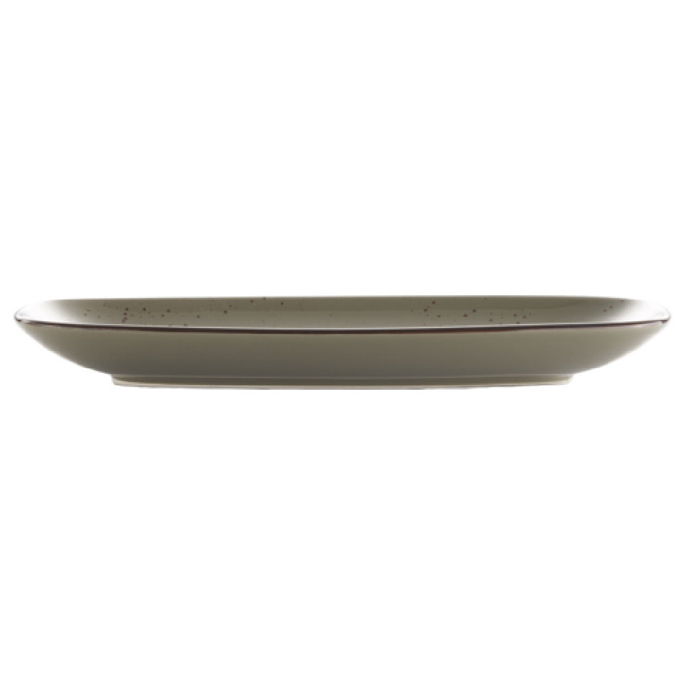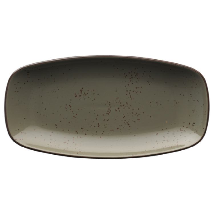 International Tableware SH-13-GS 11-5/8 Inch Organic Rectangle Platter Stoneware Green Smoke with Dark Brown Trim - 1 Dozen