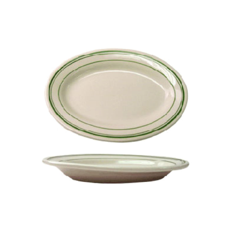 International Tableware VE-14 12-1/2 Inch Platter Oval Lead Free Ceramic White Green Band - 1 Dozen