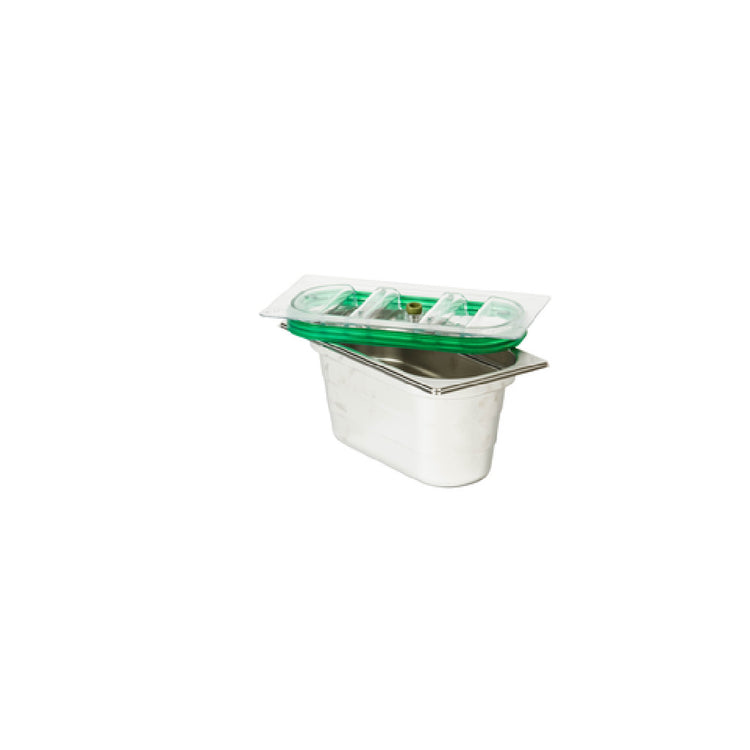 The Invacus GV150-GN1/3-6 GreenVAC Vacuum Packaging System is a commercial-grade food packaging device designed for professional kitchens and foodservice operations. This system features a 101.4 fluid oz. capacity, making it suitable for batch vacuum sealing of ingredients, prepared meals, or bulk products. Its construction includes a stainless steel container paired with a Tritan plastic vacuum lid, gasket seal, and nozzle, ensuring durability and ease of cleaning. The unit's compact footprint and oven-safe container make it an ideal addition to food prep areas requiring reliable, high-performance vacuum packaging for preservation, portioning, and workflow efficiency.