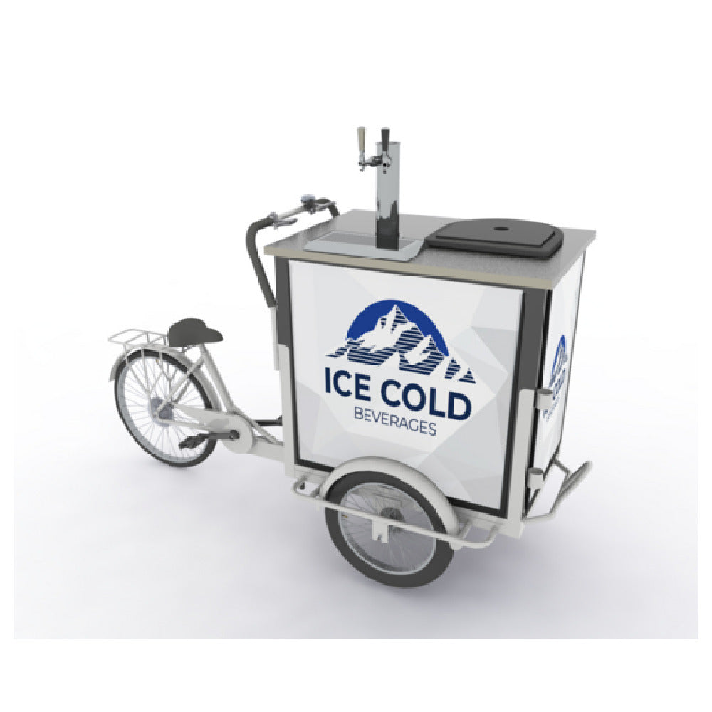 Iowa Rotocast Plastics, Inc., 731073, Draft Trike, front load, (2) 1/6 keg capacity, dual spigot draft tower, 14" drip tray, locking storage compartment, insulated iced-down coil bin with lid, 11-gallon reservoir tank, umbrella mount, powder coated metal frame