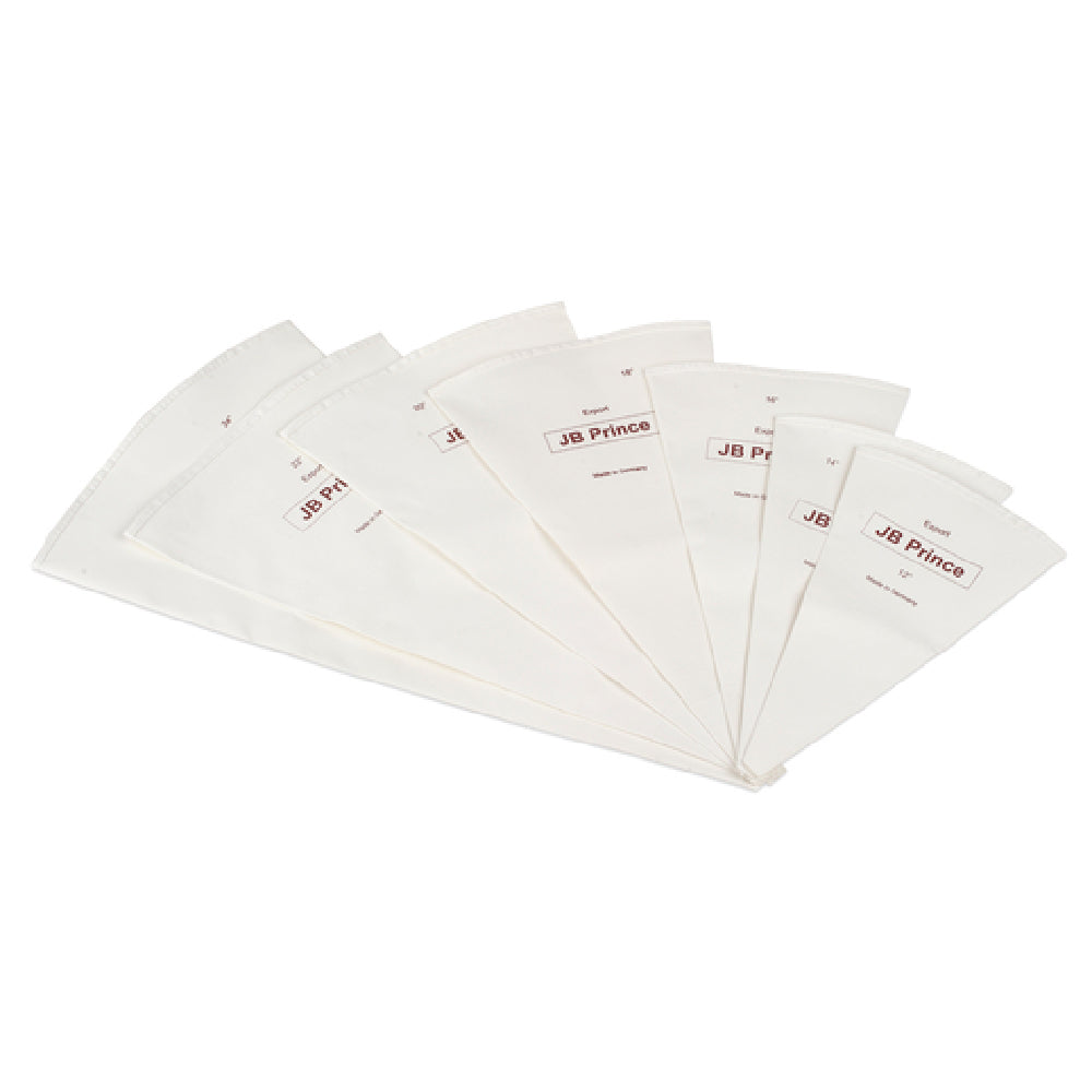 A commercial pastry bag is a professional piping tool designed for high-volume baking and pastry decoration, constructed from food-safe, durable materials such as cotton with polyurethane coating. It features reinforced bottoms and welded seams to withstand repetitive use and high-pressure piping processes. Installed in bakery, pastry, or culinary settings, the JB Prince B601 18 pastry bag is suitable for filling, decorating, and shaping pastries and confections. Its design ensures ease of cleaning, sanitation, and consistent performance, making it ideal for bakery and restaurant environments requiring reliable and hygienic piping tools.