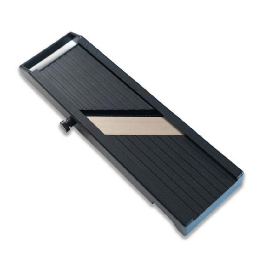 The JB Prince D395 B mandoline slicer operates with a stainless steel blade mounted within a plastic frame that measures 12.5 inches wide, 3.6 inches deep, and 1.5 inches high. It weighs approximately 1 pound, making it lightweight yet sturdy for continuous commercial use. The product features a flat, ergonomic design optimized for countertop placement and stable slicing. It includes a built-in finger guard for safety, and the blades are designed for ease of maintenance with straightforward disassembly and cleaning routines. This mandoline is adapted for high-volume vegetable and fruit preparation, supporting efficient throughput in foodservice kitchens. Its construction ensures long-term durability with corrosion-resistant stainless steel and impact-resistant plastic, suitable for frequent sanitization and handling in busy environments.