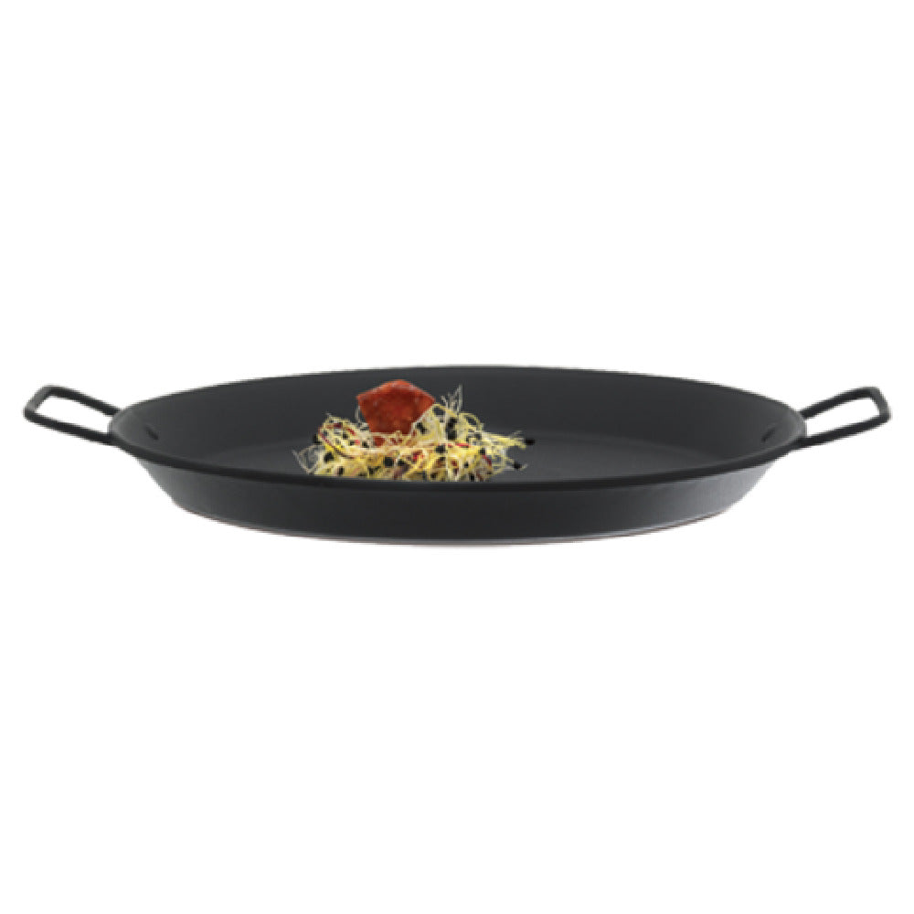 The JB Prince R883 disposable paella pan delivers precision in portioning and presentation for commercial foodservice operations. Its microwavable plastic construction simplifies reheating and service workflows, while the oval shape maximizes surface area for even heat distribution. Handles are built-in for secure handling during meal assembly and serving. Ideal for catering, event catering, and quick-service establishments, this pan supports fast-paced kitchen throughput with minimal waste and cleanup.