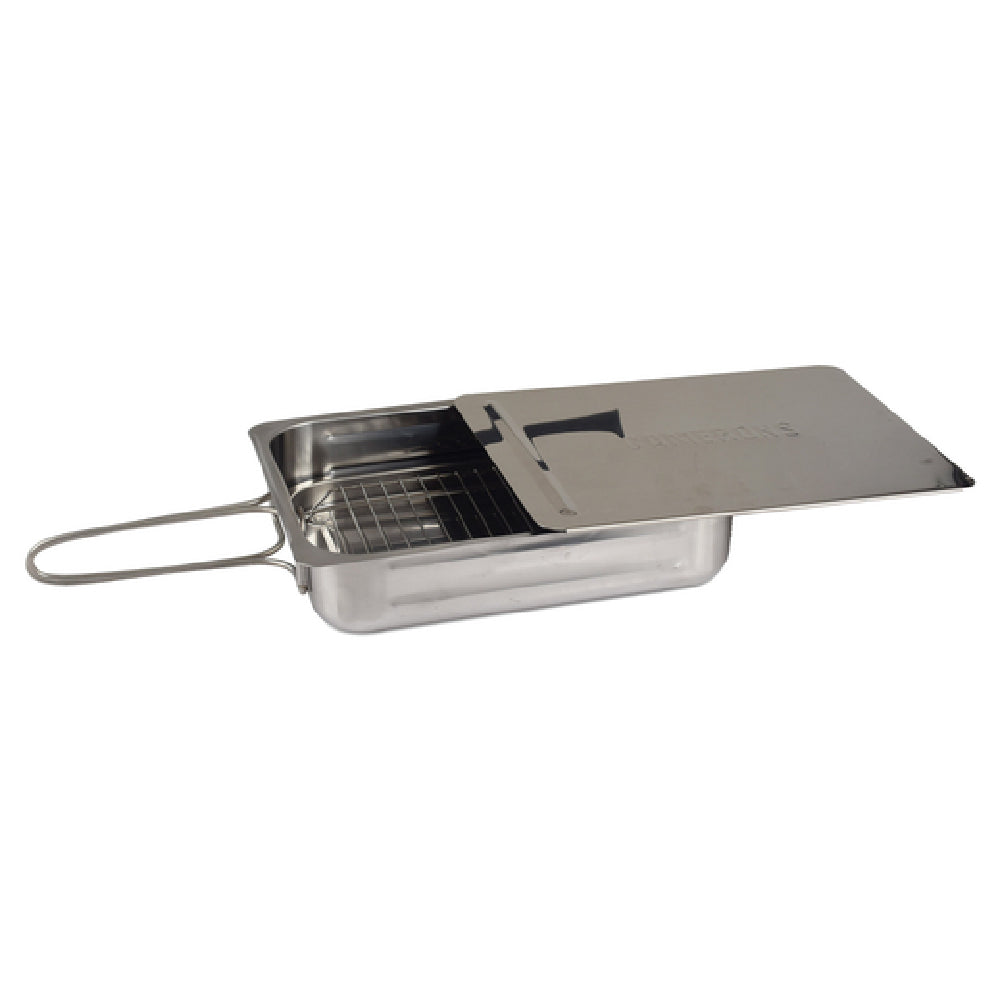 A commercial stovetop smoker is a compact culinary device designed for smoke infusion directly on standard cooking surfaces, such as open flames or electric stoves. It provides a controlled environment for flavor enhancement through thermal smoking processes, supporting short- to medium-volume food production in professional kitchens. The JB Prince S190 Cameron Stovetop Smoker features stainless steel construction, dimensions optimized for countertop use, and includes accessories like a drip tray and wire rack. It is suitable for applications such as restaurant smoking, catering, and specialty food items requiring consistent, chef-controlled smoky flavors.