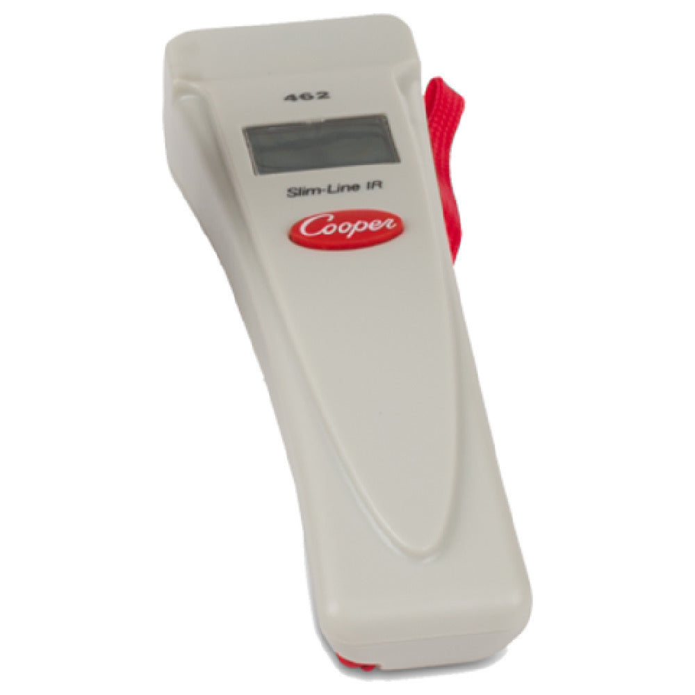 The JB Prince U782 A Cooper Laser Thermometer is a high-precision infrared device designed for accurate temperature measurement in foodservice environments. This 7-1/2" long handheld unit features an IR temperature range of -25°F to 400°F (-30°C to 204°C), making it suitable for monitoring surface temperatures of food items, cooking equipment, and serving surfaces. Powered by a standard 9-volt battery (not included), its durable plastic construction in white and red provides consistent performance for commercial kitchen applications, notably in operations requiring precise thermal checks.