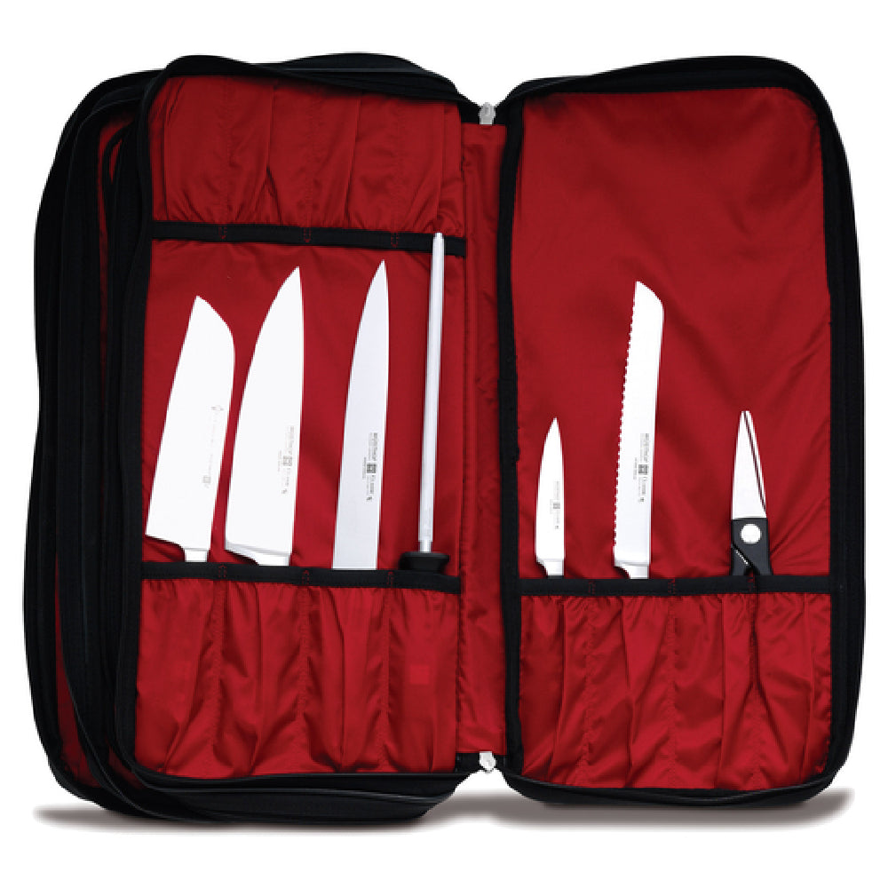 The JB Prince Z176 Mercer Knife Bag is constructed with a robust nylon fabric exterior available in black, featuring a red interior liner for clear interior visibility. Weighing 4 lbs, this soft case is designed for durability and ease of handling, supporting a wide range of kitchen operations. The bag includes (25) nylon inserts for blade organization, compatible with standard and specialty knives. It does not require electrical or refrigeration components, making it suitable for varied kitchen environments. Its dimensions offer a compact form factor for efficient storage and transportation, and the interior materials are food-safe and easy to clean. Designed to withstand daily commercial use, it supports workflow needs from catering to restaurant prep, ensuring blades are protected during transit and storage.