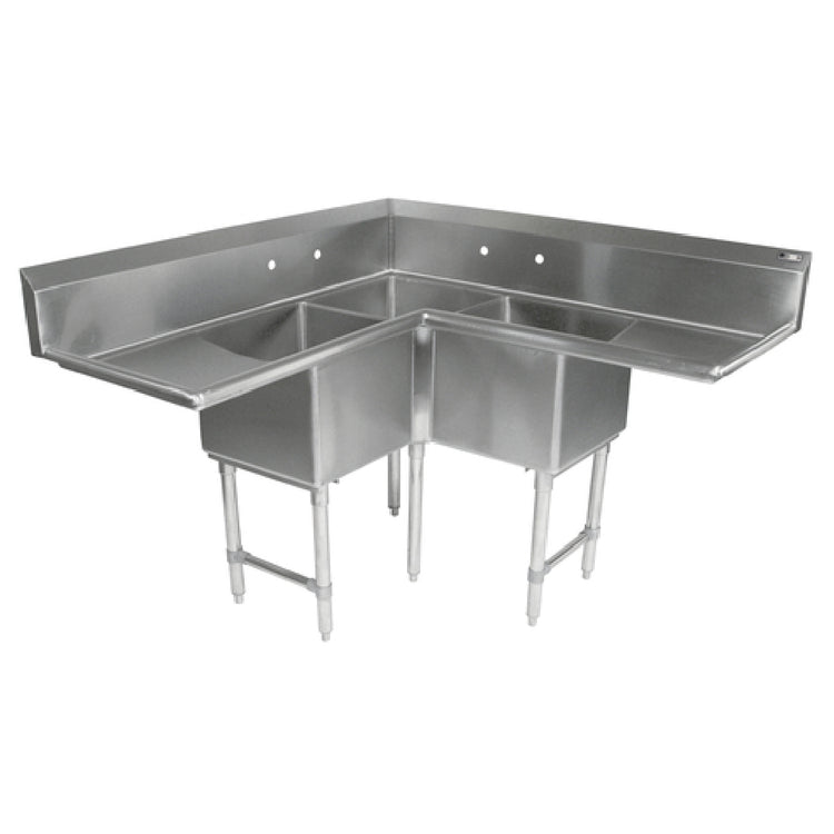 This Pro-Bowl Corner Sink integrates three compartments with precise dimensions for multi-tasking and efficient workflow in professional kitchens. Its stainless steel construction ensures longevity and ease of cleaning, supporting daily sanitation routines. The dual drainboards facilitate drainage and prep; the 10" backsplash minimizes splashes, maintaining sanitation; and the faucet holes accommodate versatile fixture setups. This configuration maximizes space utilization in busy foodservice settings, making it suitable for prep, washing, and sanitation tasks.
