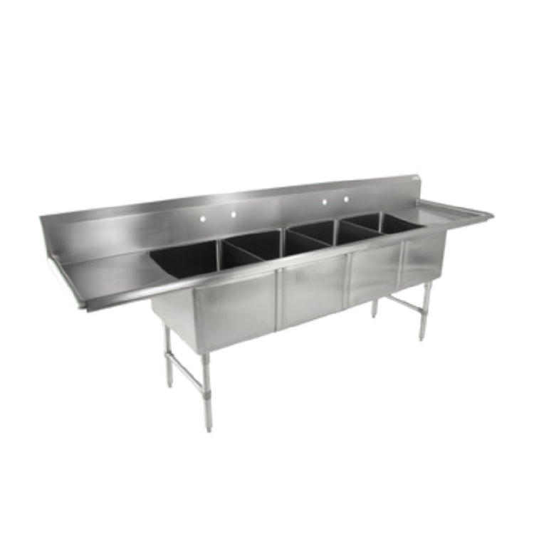 This four-compartment stainless steel sink is engineered for demanding commercial kitchens with its durable 16 gauge construction and corrosion-resistant surface. Designed for easy maintenance, it includes stainless steel legs with adjustable side bracing and bullet feet, facilitating stable installation. The sizable compartments improve workflow by accommodating large cookware and ingredients, while the drainboards support efficient draining and drying processes. Its robust design ensures long-term performance in busy foodservice environments, making it ideal for high-volume prep stations and dishwashing areas.