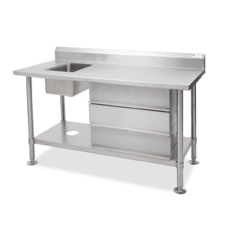 The John Boos CGS-VTS54-X Work Table With Prep Sink is a professional-grade kitchen workstation designed for efficient food preparation environments. Constructed with a 14-gauge stainless steel top from the 300 Series, it measures 54 inches wide, 24 inches deep, and 36 inches in height, providing robust durability and corrosion resistance. The unit features a large 10" W x 14" front-to-back x 8" deep sink bowl on the left side, integrated with deck mount faucet holes spaced at 4 inches and a soap dispenser hole. Its open stainless steel base includes drawers for storage and a 5-inch splash backsplash, optimizing workflow and sanitation standards in commercial kitchens, bakeries, or prep stations requiring reliable, stainless steel construction and custom fit solutions.