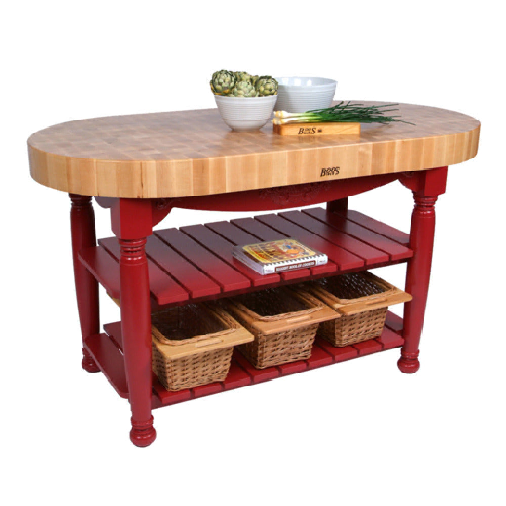 The John Boos CU-HAR60 Harvest Table Oval 60"W X 30"D X 36"H is a professional-grade butcher block workstation designed for commercial foodservice environments. Constructed with a 4-inch thick end grain maple top, it provides a durable and knife-friendly surface suitable for extensive food preparation tasks. Its Northern Hard Rock Maple material ensures long-lasting performance, while the oil finish enhances longevity and ease of maintenance. The unit features a painted base with two slatted undershelves for practical storage, complemented by three wicker baskets for ingredient organization. This stationary harvest table offers an overall size of 60 inches in width, 30 inches in depth, and 36 inches in height, making it ideal for kitchens requiring robust, spacious work surfaces integrated into daily culinary workflows.