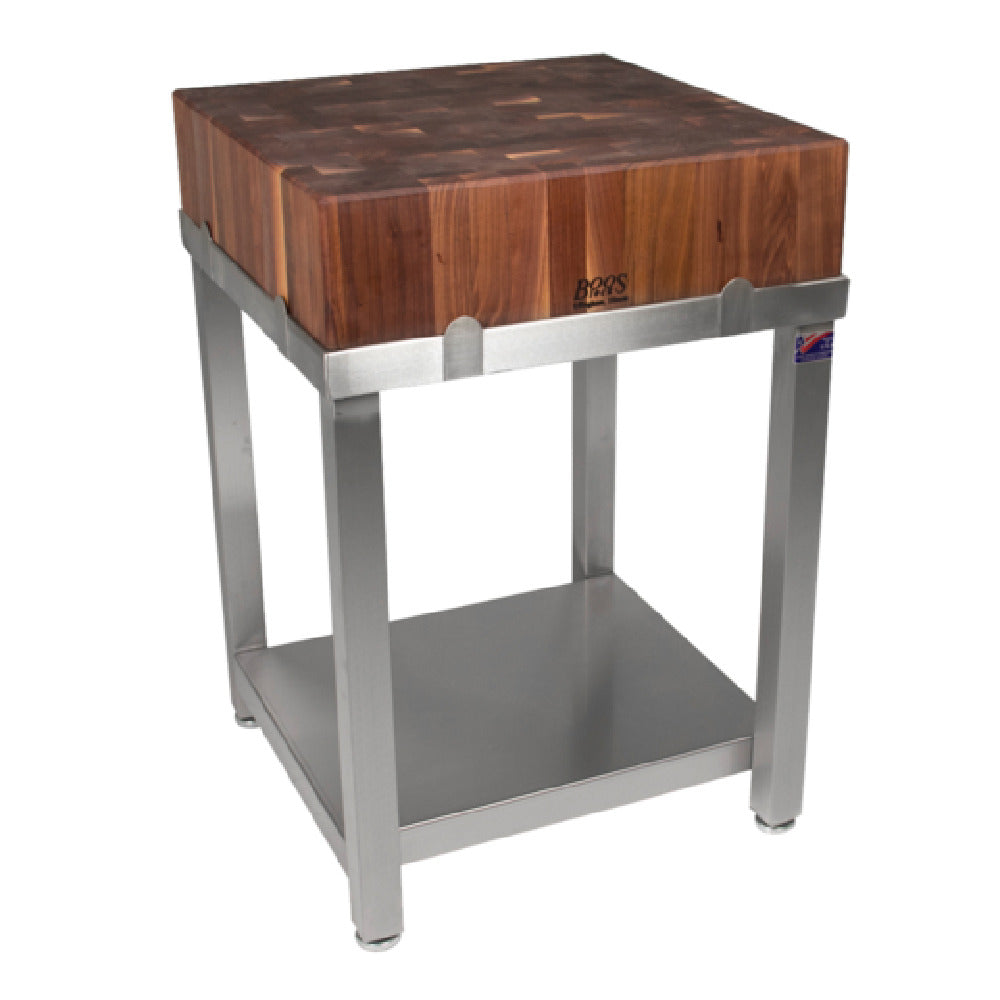 The John Boos CUCLA24B butcher block stand combines a solid hardwood top with a robust stainless steel base, optimized for food prep and staging. Its welded construction and adjustable leveling feet ensure stability on uneven floors, while the solid undershelf offers additional storage. This unit’s 24-inch by 24-inch footprint accommodates various kitchen workflows, facilitating efficient ingredient handling and presentation in commercial settings.
