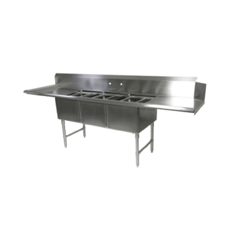 The John Boos DT3B18244-2D24L Dishtable with Potsinks exemplifies commercial kitchen equipment designed for high durability and precise functionality. Constructed from 16-gauge 300 series stainless steel, this top-mounted dishtable features a clean, straight shape with overall dimensions of 103-5/8" W x 30-3/8" D x 44-1/16" H. It includes three 18" wide compartments measuring 24" front-to-back with 14" depth, two 24" drainboards for efficient utensil and equipment drying, and a dish machine attachment positioned on the right side. The unit’s boxed backsplash is 10" high, with a splash mount faucet hole set at 8" centers, facilitating streamlined workflow. Designed for rigorous foodservice environments, it offers easy maintenance and seamless integration into high-capacity setups, making it ideal for commercial kitchens seeking durable, functional sinks with comprehensive compartmentalization.