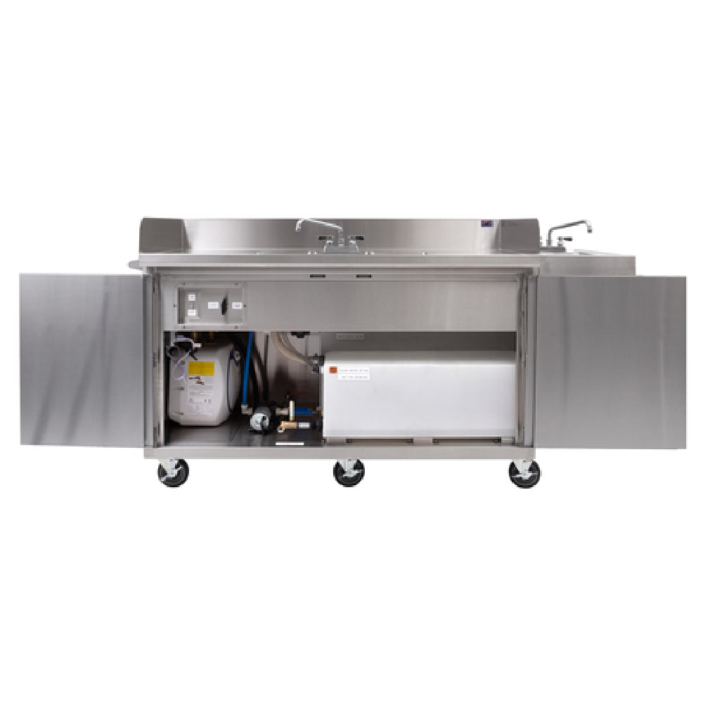 The John Boos MCS3-1014-HS Mobile Hand Sink 3-compartment With Hand Sink Self Contained is a commercial-grade handwashing system designed for versatile foodservice environments. Constructed entirely of durable stainless steel, this self-contained unit measures 75"W x 28"D x 43-13/16"H and features three 10" wide x 14" deep compartments with 5" depth, optimized for efficient hand hygiene and component organization. Equipped with a 16-gauge stainless steel top, a 5" rear riser, side splashes, and a marine edge, it ensures sanitation and ease of cleaning. The integrated hand sink with a 10" swing spout faucet and soap/towel dispensers provides meets sanitation standards, making it ideal for hospitality, catering, and healthcare facilities. The unit includes city water connections or a 20-gallon stationary fresh water tank, a 30-gallon waste water tank, and a 2-1/2 gallon water heater for operational flexibility. Powered by 120V electrical supply, it includes a GFI outlet with a 6-foot cord, with locking casters for mobility, providing a comprehensive solution for mid-volume handwashing needs.