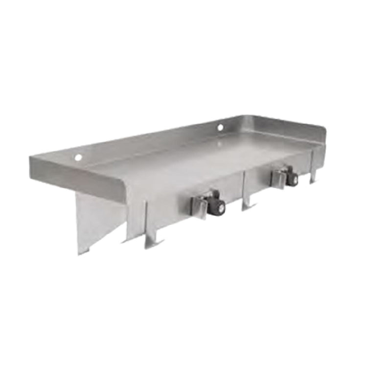 John Boos, PB-MSS824, Utility Shelf, wall-mounted, 24"W x 8"D, Stallion Safety Edge front, 1-1/2" riser on sides & rear, includes hooks & (2) mop/broom holder with locking cam, 16/300 stainless steel, KD