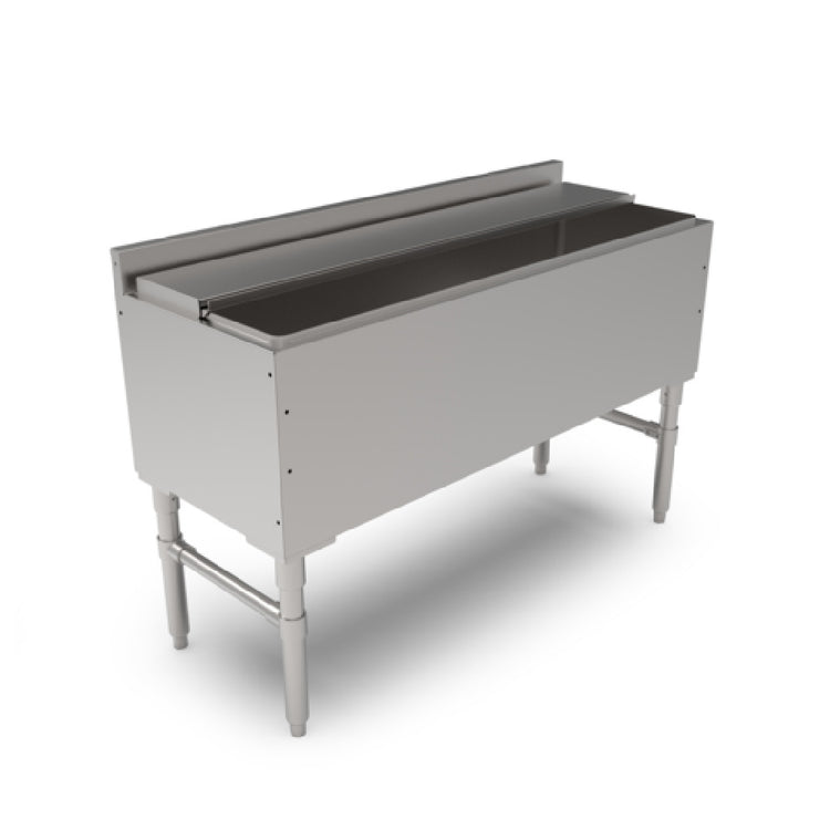 The John Boos UBIB-1848 Slim-Line Underbar Ice Bin/Cocktail Unit is a commercial-grade ice storage and prep solution designed for optimized bar operations. Crafted from durable 18/300 stainless steel, this underbar unit measures 48 inches in width, 18 inches in depth, and stands 32-1/2 inches high overall. It features a 46-inch wide, insulated ice bin with drain, providing efficient ice management for quick beverage service. The unit includes a 3-inch backsplash for splash protection and a two-piece sliding lid for convenient access. Its robust construction ensures long-lasting performance in high-traffic foodservice environments, making it suitable for bars and beverage stations that require reliable, maintenance-friendly ice storage with precise dimensions and NSF compliance.