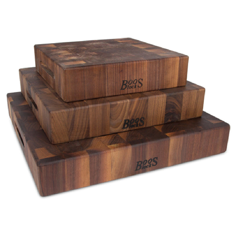 A commercial cutting board is a heavy-duty, food-safe surface used in professional kitchens to prepare meats, produce, and other ingredients. Designed for high-volume culinary operations, this type of cutting board typically features durable materials like hardwood or synthetic composites. The John Boos WAL-CCB121203 is a square, end grain, USA-made Walnut cutting board with a 12-inch width, 12-inch depth, and 3-inch thickness, suitable for butcher shops and restaurant prep stations that require knife-friendly surfaces and long-lasting performance. Its robust construction supports rigorous use and sanitation in high-turnover environments.
