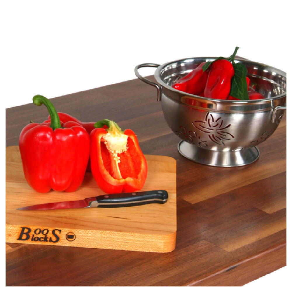 The John Boos WAL-CUCKNB430 Cucina Classico Table features a 48"W x 30"D wood top made from American Black Walnut with a Varnique finish, supported by stainless steel legs with bullet feet for maximum stability. The overall height is 35 inches, optimized for ergonomic ease in culinary workflows. Weighing 65 lbs, it is designed for straightforward handling and installation. The table's construction fortifies its resistance to moisture and stain penetration, ideal for food prep areas demanding high sanitation standards. Its open base with center bracing provides structural integrity suited for moderate to high-volume foodservice operations. The table does not include built-in storage but offers a resilient, easy-to-clean surface compatible with various kitchen layouts.