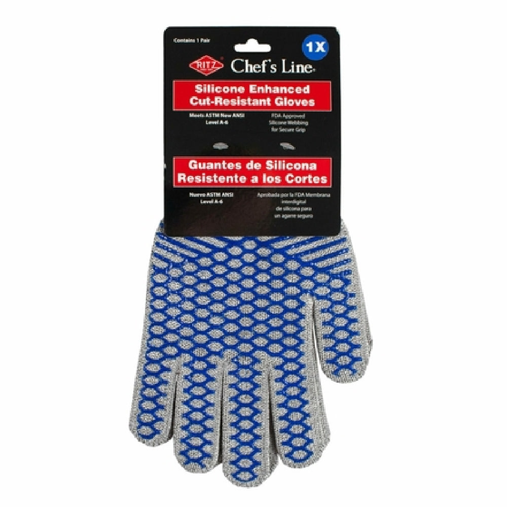 The John Ritzenthaler Company CLRZSCGL1X Ritz® Chef's Line® Cut Glove is a specialized protective glove designed for use in commercial kitchen environments. Made from FDA-approved silicone webbing, this cut-resistant glove offers enhanced safety features for foodservice operators handling sharp equipment. Its bleach-safe and machine washable construction ensures durability and ease of maintenance specific to high-demand culinary workflows. With ANSI level A6 cut resistance, the glove provides reliable protection for food prep, slicing, and other offensive tool handling, integrating seamlessly into safety protocols for professional kitchens.
