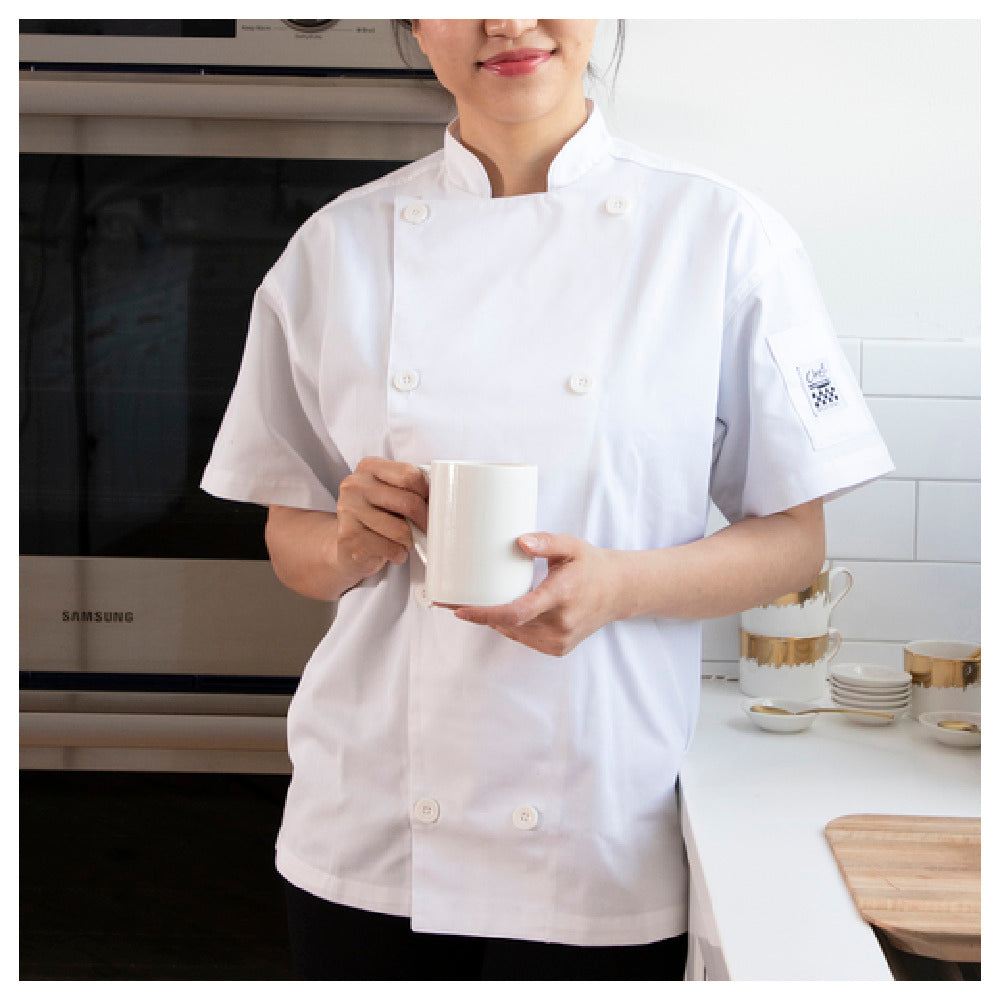 This chef’s jacket offers essential features tailored for commercial kitchens, including a large pen/thermometer pocket integrated into the chest, facilitating quick access to writing tools and temperature probes. The poly/cotton fabric enhances durability and simplifies cleaning routines, while the short sleeve and drop shoulder cut provide ergonomic fit for prolonged wear. Its white finish aligns with sanitation standards, and the lightweight construction supports multi-shift use in moderate-workload kitchens, making it an ideal choice for culinary professionals requiring functional chef apparel.