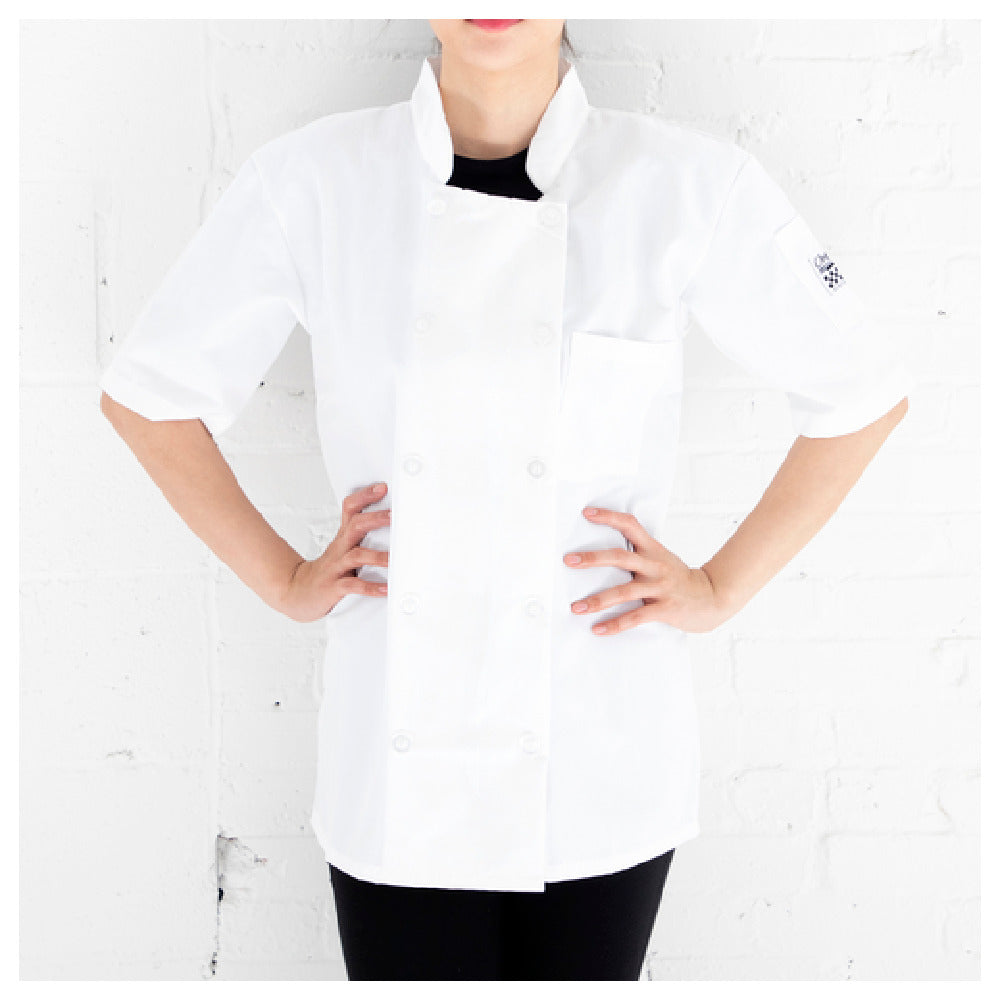 Chef Revival, J105-L, Chef Revival® Basic Chef's Jacket, large, universal fit, double breasted, short sleeve, front chest and pen/thermometer pocket, clear pearl 10 buttons, traditional collar, poly/cotton, white